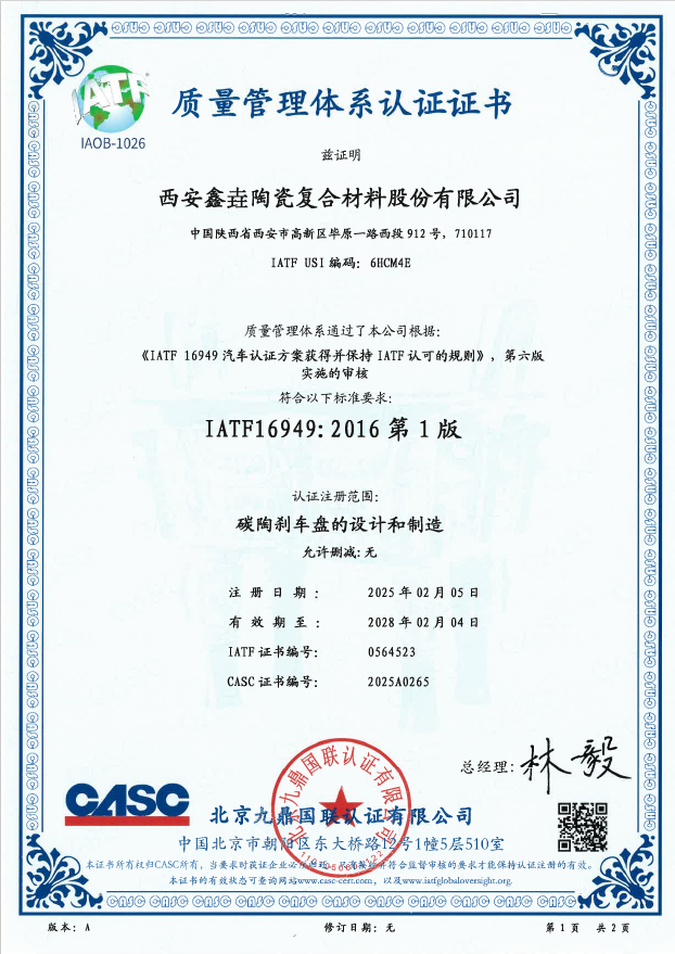 近日,西安鑫垚陶瓷復(fù)合材料股份有限公司收到了北京九鼎國(guó)聯(lián)認(rèn)證有限公司下發(fā)的IATF 16949汽車質(zhì)量管理體系認(rèn)證證書(shū),認(rèn)證注冊(cè)范圍為“碳陶...
